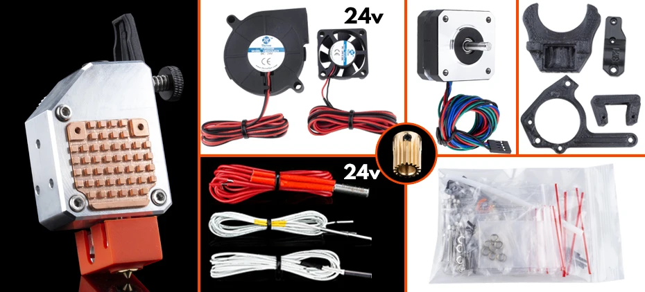 Основание экструдера BMG x1 Ручка экструдера BMG x1 Обработанные детали: AL-BMG экструдер с воздушным охлаждением Блок обогревателя AL x1 Насадка из латуни 0,4 x1 Тепловой выключатель полностью металлический x1 Механические детали: Шестеренный вал x1 Шестерня двигателя x1 Нить привода одна пара 5*8*2,5 подшипники x2 Shaft 3 вал l30мм x1 Shaft 3 вал L20 мм x1 Застежка: Гайка M3 x 5 Галстук на молнии x 5 M2.5 самонарезание x 2 M3X10 x 5 M3x35 x 3 M3x20 x 2 M3 пружинная шайба x 7 M2.5x16 x 2 M2x5 x 2 M2x8 x 2 Пружина x 1 Винт для большого пальца x 1 Нейлоновая шайба x 1 Электрический: 5015 24/12V вентилятор 1 метр провод и разъемы x1 3010 24/12V вентилятор 1 метр провод и разъемы x1 Патронный нагреватель 12/24V 40 Вт x1 Термистор NTC100K B3950 x1 Термистор 104GT-2 x1 Удлинитель 1 метр x1 * Nema17-23MM шаговый двигатель x 1 (нужно купить SET3 или SET4) Аксессуары: 4x2 PTFE трубка L = 34 мм фаски 4x2 PTFE трубка L = 100 мм Термоусадочная трубка x8 Трубка Bowden collet x1 Зажимы для Цанга x2 Набор ключей Allen x1 Дополнительно: Датчик приближения M8 5V TL-touch ABL сенсор Комплект монтажной пластины для принтеров CR/Ender * Если вам нужен Nema17-23 шаговый двигатель,Пожалуйста,Нажмите здесь, чтобы купить. * Если вам нужен 3D сенсорный датчик, Пожалуйста,Нажмите здесь, чтобы купить. * Если вам нужен индуктивный датчик приближения M8,Пожалуйста,Нажмите здесь, чтобы купить.