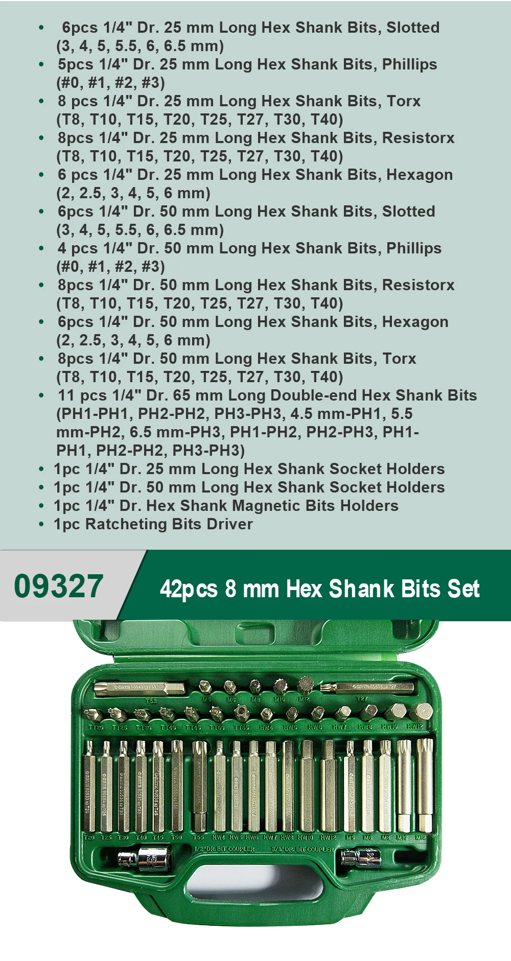 14 шт., 1/4 дюйма, Dr. 6 pt. Разъем (3,5, 4, 4,5, 5, 5,5, 6, 7, 8, 9, 10, 11, 12, 13, 14 мм) длинные шестигранные наконечники Dr. 25 мм, 7 шт., 1/4 дюйма, Torx (T10, T15, T20, T25, T27, T30, T40) Длинные шестигранные наконечники Dr. 25 мм, 7 шт., 1/4 дюйма, резисторы (T10, T15, T20, T25, T27, T30, T40), 4 шт., 1/4 дюйма, Dr. 25 мм, Длинные шестигранные наконечники, phillips (#0, #1, #2, #3) 4 шт., 1/4 дюйма Dr. 25 мм длинный шестигранный хвостовик битов, прорези (3, 4, 5,5, 6,5 мм) 6 шт. 1/4 "д-р длиной 25 мм шестигранный хвостовик битов, болты с шестигранной головкой (2, 2,5, 3, 4, 5, 6 мм) 3 шт. 1/4 "д-р 50 мм длинный шестигранный хвостовик битов, прорези (4, 5,5, 6,5 мм); Комплект из 3 вещей; 1/4" д-р 50 мм длинный шестигранный хвостовик битов, Torx (T15, T20, 3 шт., шестигранные долота 1/4 "Dr. 50 мм, Phillips (#1, #2, T25) #3) 3 шт., шестигранные долота 1/4 "Dr. 50 мм, шестигранные (4, 5, 6 мм) 1 шт., держатель с шестигранным хвостовиком 1/4 дюйма Dr. 25 мм, 1 шт., 1/4 дюйма, Dr. 50 мм, длинные держатели с шестигранным хвостовиком, 1 шт., 1/4 дюйма, 1 шт., держатель с шестигранным хвостовиком для магнитных бит, 1 шт. ПК 1/4 "Dr. Bit адаптер 1/4" Dr. гибкий удлинитель 6" Высококачественный Cr-V Материал, устойчивый к коррозии.