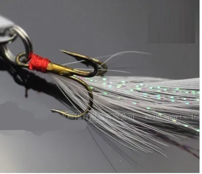 Характеристики изделия: передний конец оснащен двойной петлей, конец с двойной петлей, с колючей тройной якорной крючком, завязанной белыми перьями.