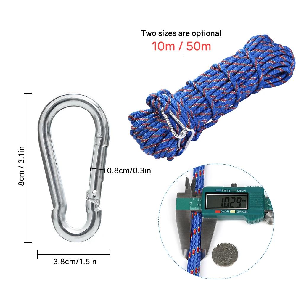 Особенности: Изготовлен из полиэфирного материала для веревки, сверхпрочный сплав стальной материал для карабинов. Диаметр веревки-10 мм. Максимальная несущая способность веревки до 661lbs (макс. 3 кН). Легкий, но прочный, легко носить. Каждый карабин может вместить до 661lbs (макс. 3 кН).