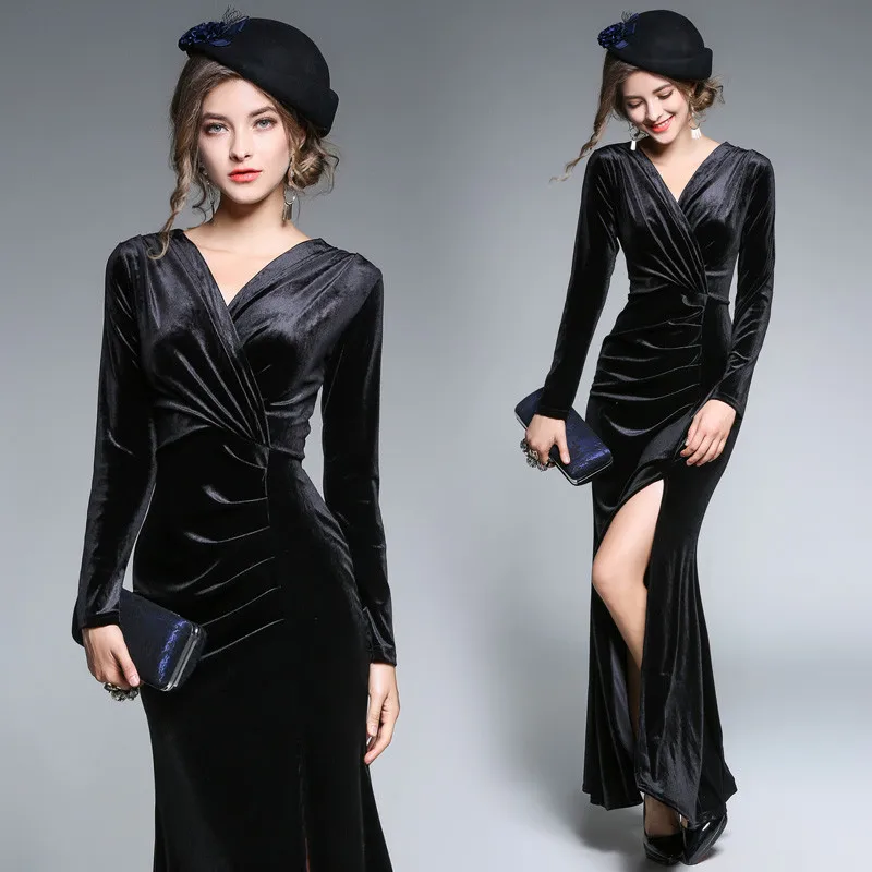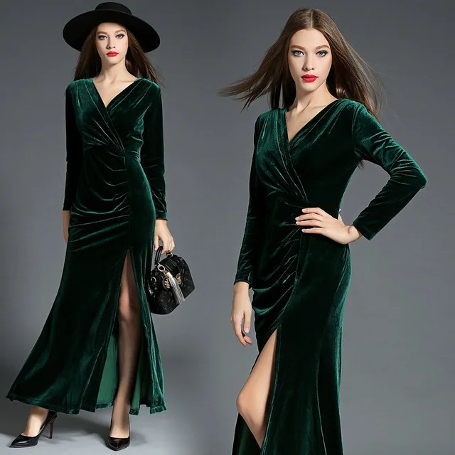 Женское элегантное бархатное платье с длинным рукавом, черное, красное, зеленое платье макси, вечерние платья, одежда для женщин, Осень-зима 2019