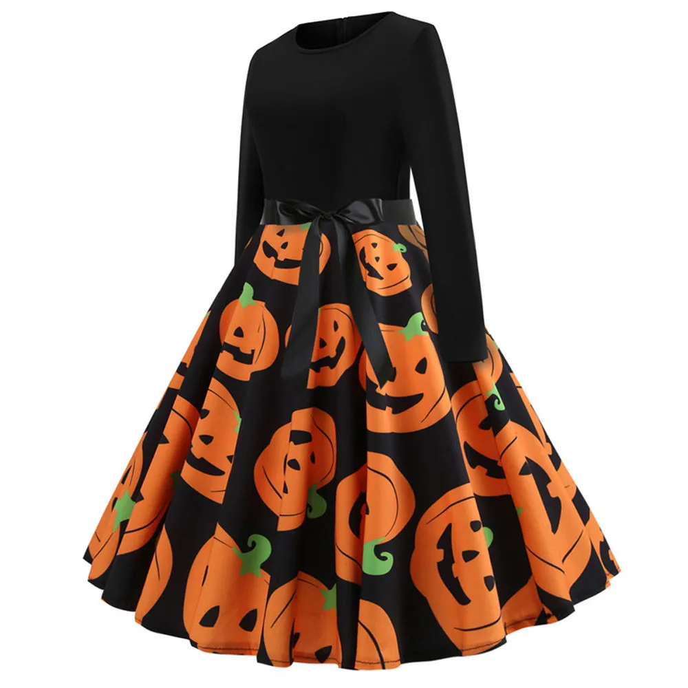 Винтажное платье Принт на Хэллоуин, готический стиль, высокая талия и расклешенные Дизайн низа может показать вашу стройную талию и теленок, будь то одно или пальто с галстуком-бабочкой, очень красивое