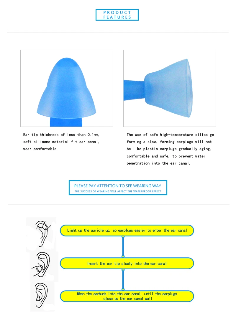 2.the use of safe high-temperature silica gel forming a slow, forming earplugs will not be like plastic earplugs gradually aging,comfortable and safe, to prevent water penetration into the ear canal.