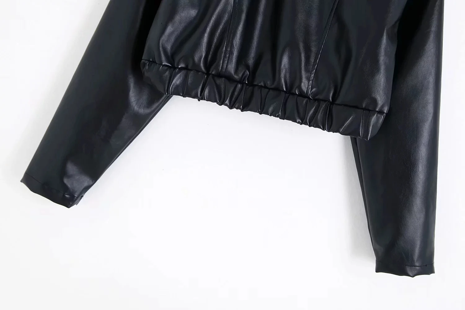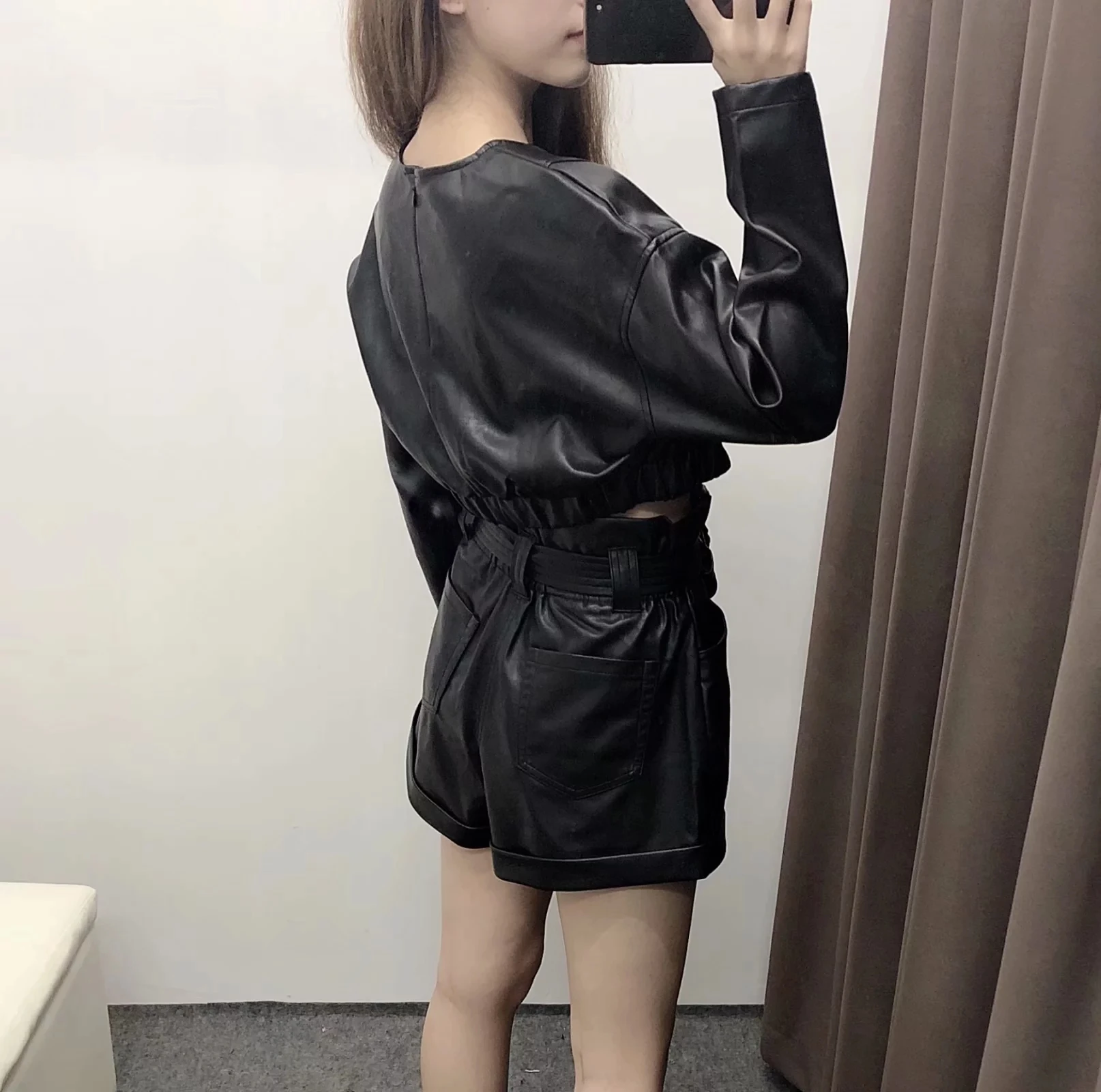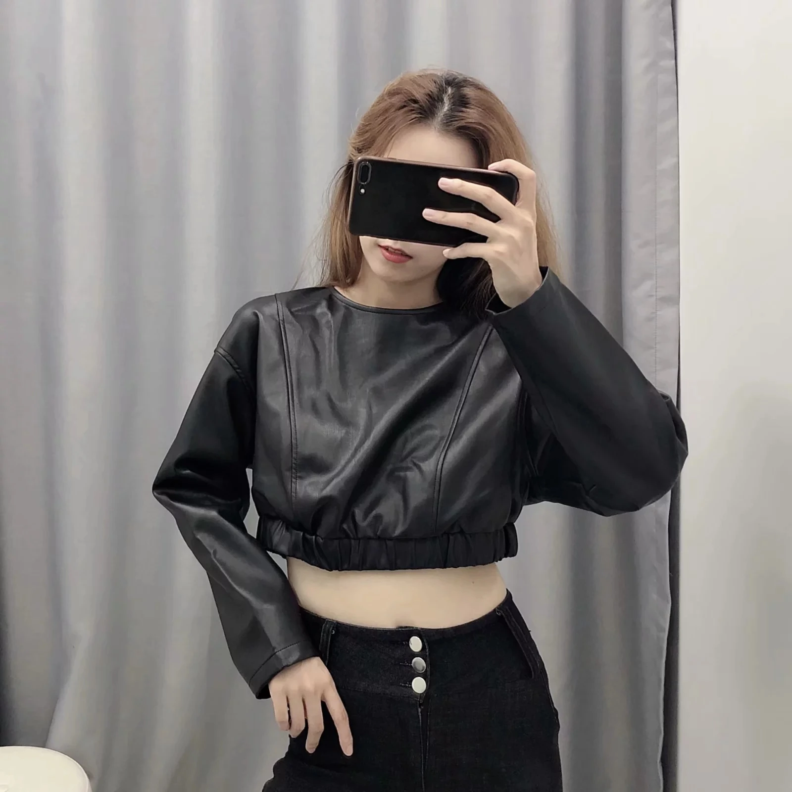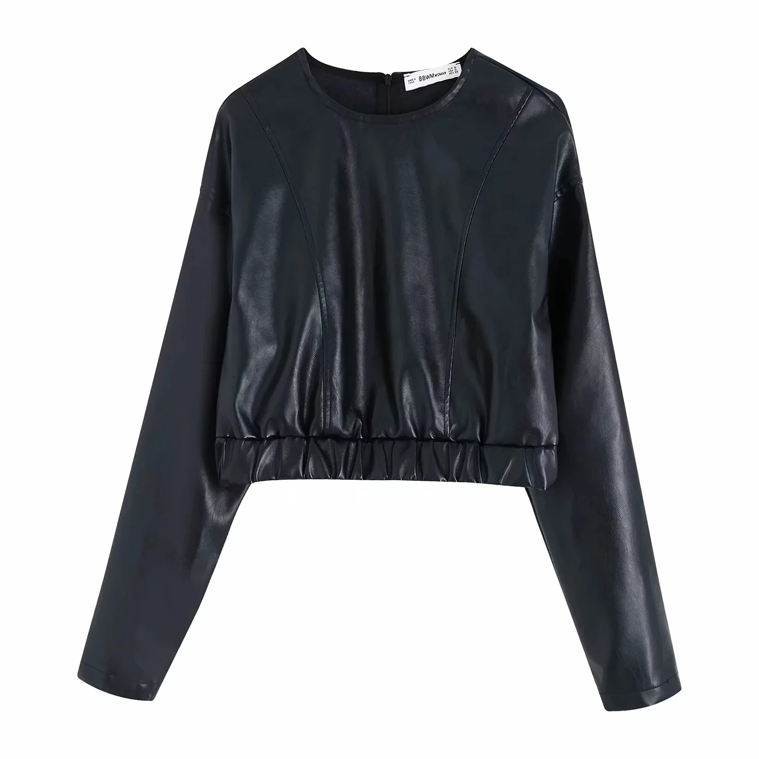 Женская футболка из искусственной кожи с длинным рукавом, черные короткие топы футболки с эластичной талией, укороченный топ zora, осенняя футболка za femme