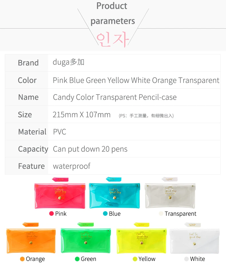 Материал: ПВХ Размеры: 215mmX107mm Цвет: розовый, синий, зеленый, желтый, белый, оранжевый, прозрачный Особенности: водонепроницаемый Упаковка: 1 шт