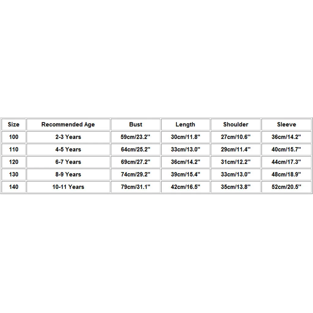 Размер Рекомендуемый возраст Обхват груди Длина Сумка на плечо Рукава 100 От 2 до 3 лет 59 см/23,2'' 30 см/11,8" 27 см/10,6'' 36 см/14,2" 110 От 4 до 5 лет Высота голенища 64 см/25,2" 33 см/13,0" 29 см/11,4'' 40 см/15,7" 120 От 6 до 7 лет 69 см/27,2" 36 см/14,2" 31 см/12,2'' 44 см/17,3" 130 От 8 до 9 лет 74 см/29,2" 39 см/15,4" 33 см/13,0'' 48 см/18,9" 140 От 10 до 11 лет 79 см/31,1" 42 см/16,5" 35 см/13,8'' 52 см/20,5''
