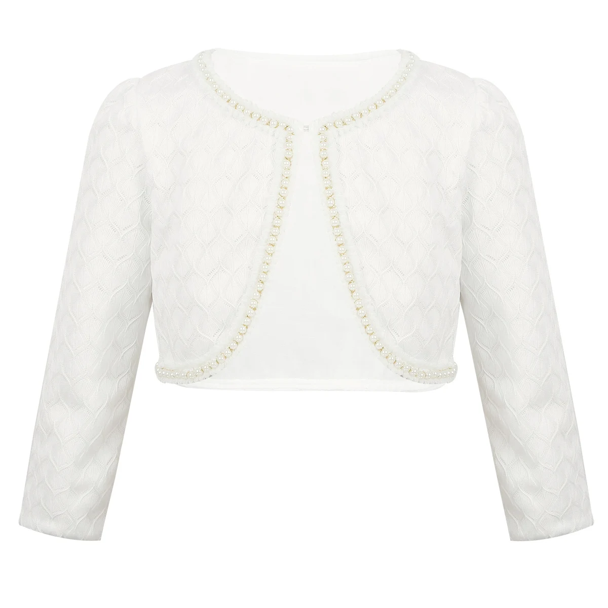 Длинные рукава, круглый воротник, застежка на одной пуговице, украшена отделкой из искусственного жемчуга.
