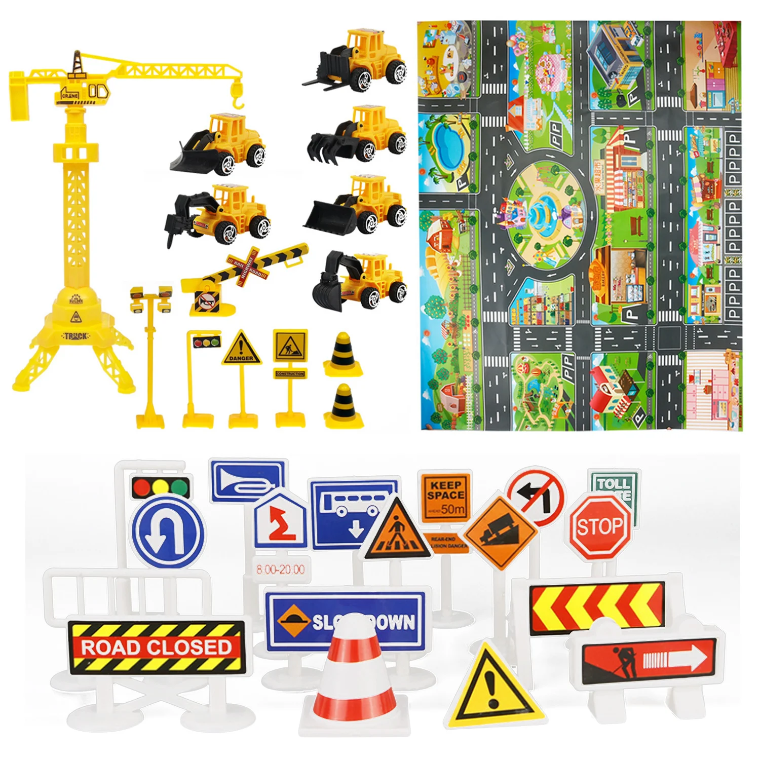 Большие масштабные игрушки:Игровой коврик для дорожного движения, который обеспечивает удобную игровую площадку для детей, защищая пол. Он оснащен 18 Дорожными знаками и 14 инженерными строительными игрушками, чтобы сделать ваших детей веселее.
