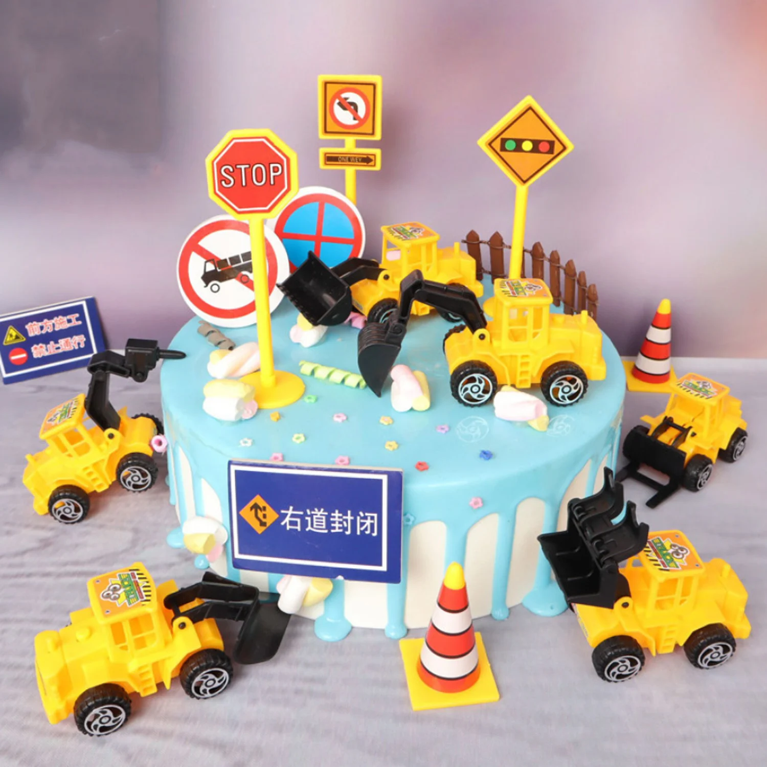 14pcs Mini Construction Vehicle Toys Set with 6 Trucks 7 Traffic Sign 1 Hanging Tower Toy Cars Play Sets for Kids 14Pcs