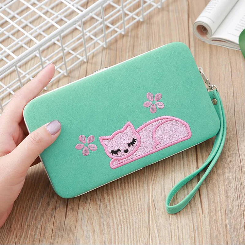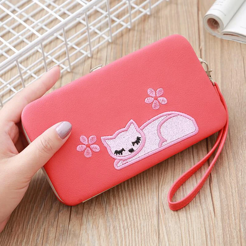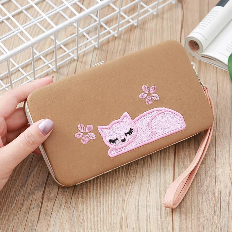 Новый мультяшный длинный женский кошелек с вышитым котом, Большой Вместительный клатч, классический стиль, Дамский кошелек, милый кошелек для карт