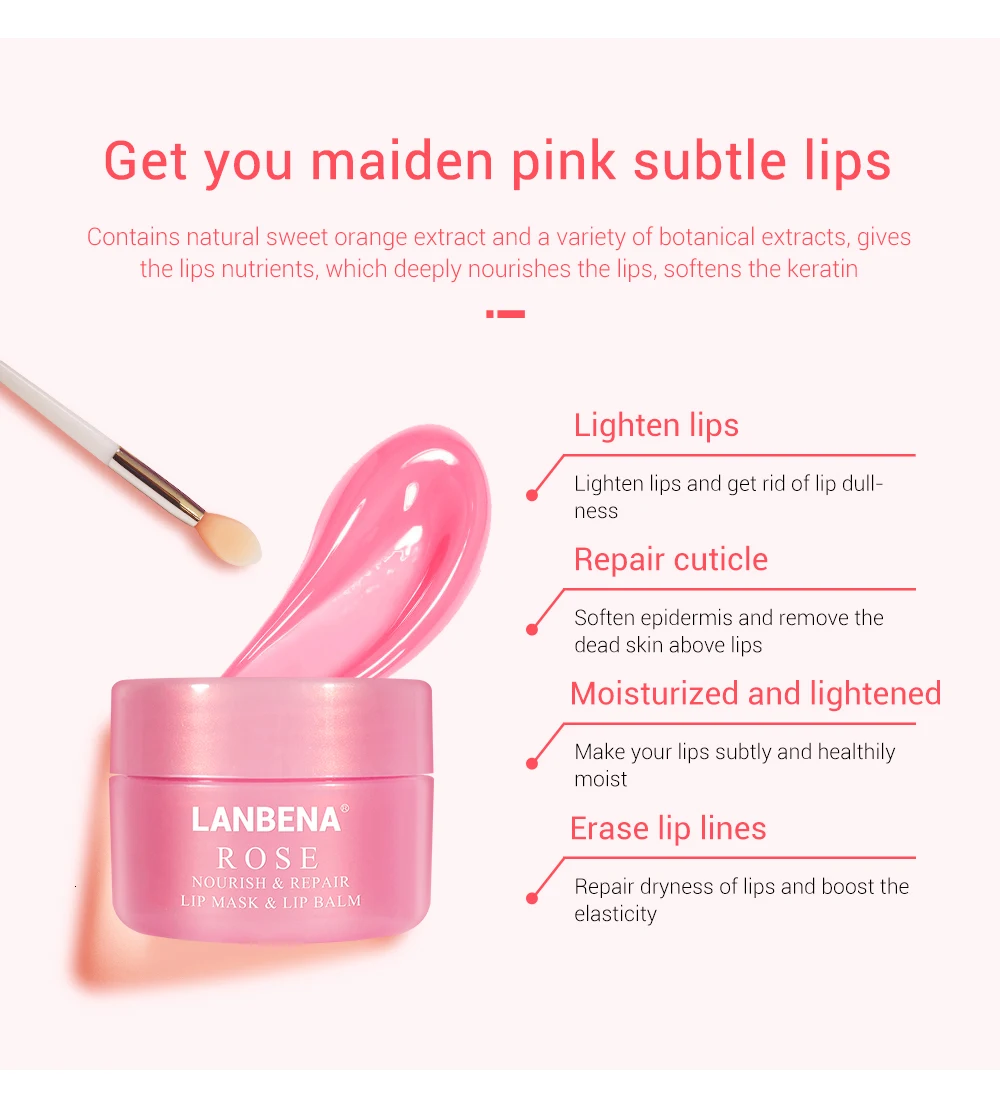 Effects:Contains natural rose extract, super moisturizing, improving dull lip skin, exfoliating lip dead skin, diminishing lip lines, and moisturizing lip color, repairing lips during sleep time.