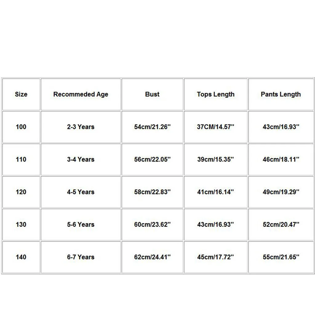 Size Recommeded Age Bust Tops Length Pants Length 100 2-3 Years 54cm/21.26'' 37CM/14.57'' 43cm/16.93'' 110 3-4 Years 56cm/22.05'' 39cm/15.35'' 46cm/18.11'' 120 4-5 Years 58cm/22.83'' 41cm/16.14'' 49cm/19.29'' 130 5-6 Years 60cm/23.62'' 43cm/16.93'' 52cm/20.47'' 140 6-7 Years 62cm/24.41'' 45cm/17.72'' 55cm/21.65''