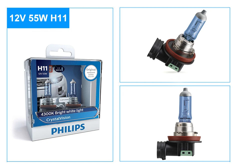 Яркий белый свет до 4300 K Тип лампы: H11 В наборе: 2 + 2 шт. 12 В, 55 Вт Стиль Яркий белый свет до 4300 К для совершенного стиля Лампы головного освещения CrystalVision с голубым покрытием колбы и серебристым колпачком излучают яркий белый свет до 4300 К, что обеспечивает хорошую видимость и делает ваш автомобиль более заметным. Эти лампы подходят для вождения как в городе, так и за городом. Автомобильные лампы Philips отличаются высокой устойчивостью к УФ-излучению Специальное разработанное Philips покрытие предохраняет фары от вредного ультрафиолетового излучения, что делает кварцевое стекло Philips идеальным вариантом для всех условий вождения и гарантирует его долговечность. Широкий ассортимент ламп 12 В для любых нужд Какова область применения ламп 12 В? Решения Philips Automotive подходят для всех вариантов: дальний свет, ближний свет, передние противотуманные фары, передние и боковые указатели поворота, задние указатели поворота, стоп-сигналы, фонари заднего хода, задние противотуманные фонари, освещение номерного знака, задние габаритные/стояночные фонари, освещение салона.