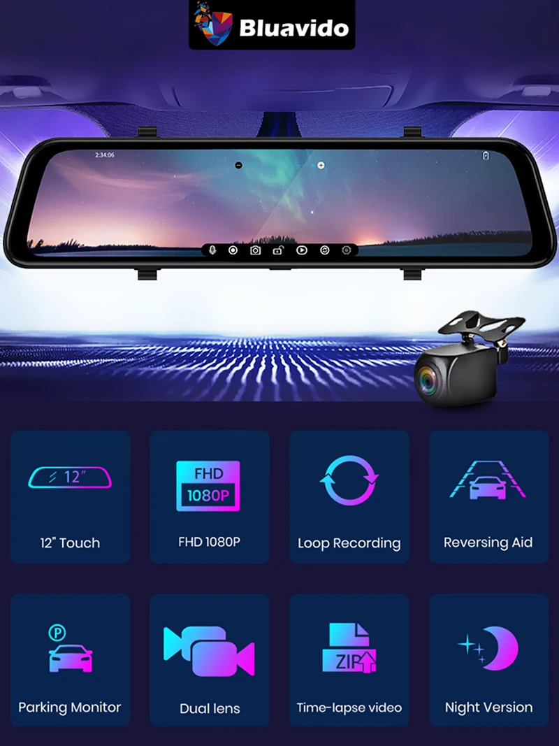 * 12 дюймов IPS сенсорный экран, легко чесотки и эксплуатации. * Двухканальная система с передними и задними камерами и одновременной съемкой. * Передняя камера Сенсор SONY IMX 335 , 2K(2560*1440), 25fps, 170 градусов плюс полный 6 слоев стекла объектив с F/1,8 широкой апертурой. * Запись видео составляет 1920x108 0P/30 кадров в секунду, 1280x72 0P/30 кадров в секунду. * Запись на задней камере-это SONY IMX 307, FHD 1080P, 25fps, объектив 140 градусов с водонепроницаемостью IP67. * Процессор HisiliconHi 3556 * Антиослепительное синее зеркало для экрана. * Погодозащищенная резервная камера. * Камера заднего вида с парковкой, переключатель с одной кнопкой. * Встроенный аккумулятор ёмкостью до 650 мАч. [Нужно Всегда подключать автомобильное зарядное устройство к работе] * Циклическая запись перезаписывает самые старые кадры с новейшими после заполнения карты. * Обнаружение движения: Поддержка * Монитор парковки: поддержка [необходимо использовать с бак-линией OBD] * Температура хранения: -20 ℃ ~ 70 ℃ * Температура эксплуатации: 0 ℃ ~ 50 ℃ * Ночное видение при сласветильник дает вам четкое изображение даже в темноте. * Внешняя память: до 64 ГБ, карта micro sd класса 10.(не входит в комплект)