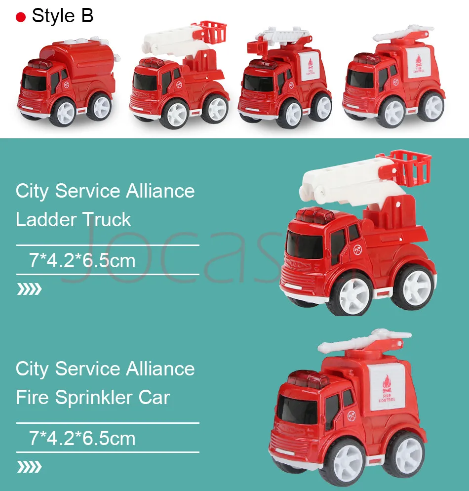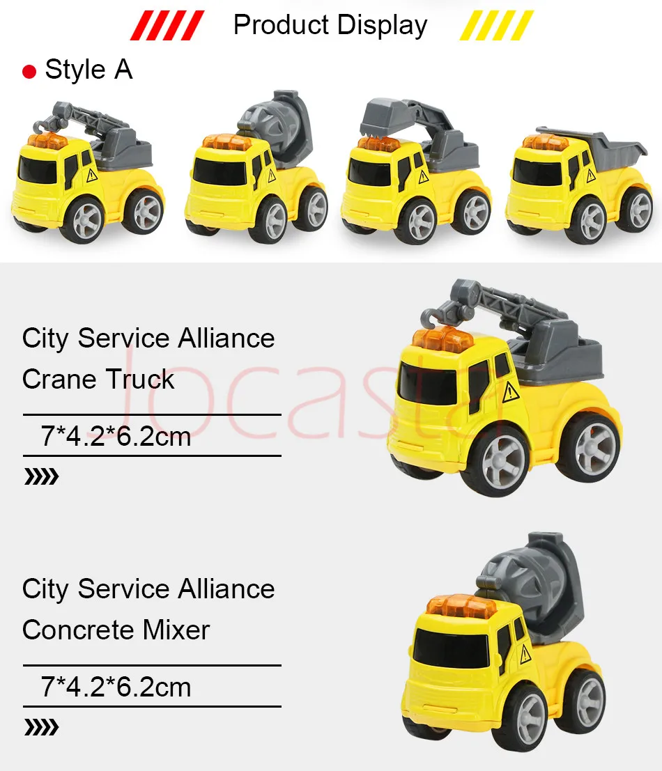 Особенности: 1. Изготовлен из металла и экологически чистого пластика с высоким качеством. 2. Портативный размер, легко для детей, управляя и играя. 3. Мощность: автомобиль управляется инерцией. 4. Прочная и прочная конструкция, головка автомобиля изготовлена из сплава. Технические характеристики: 1. Цвет изделия как показано на картинке (красный, желтый) 2. В том числе: Стиль A: кран грузовик, бетономешалка, самосвал, экскаватор. Стиль B: лестница грузовик, пожарная машина