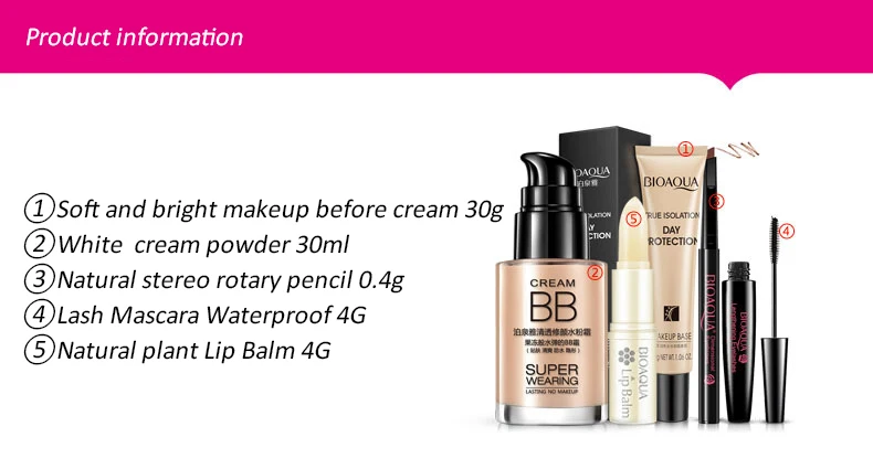 BIOAQUA Bright Cosmetics Makeup Set Lip Balm BB Cream Eyebrow Pencil Mascara Cream Makeup Base 5pcs