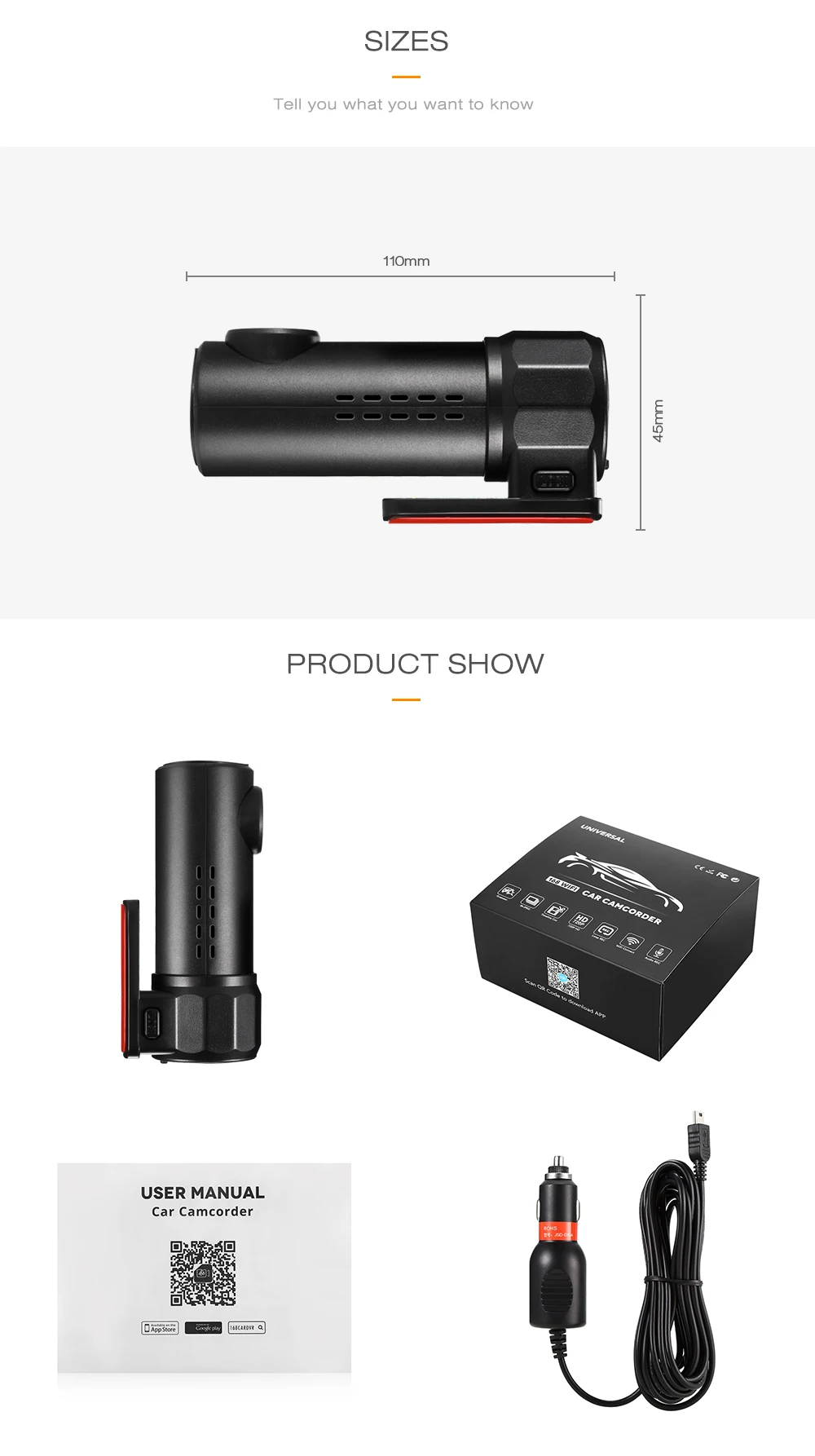 ● 1280*720P Full HD ● Поле зрения 170 ° и ночное видение HD ● Встроенные g-датчики для автоматической аварийной записи ● Управление мобильным приложением (Android 6,0 выше/iOS) (поддержка английских команд) ● Язык приложения: китайский/английский/русский/японский/немецкий ● Бесплатный wifi: Поддержка просмотра видео и загрузки Посылка включает в себя: видеорегистратор + Автомобильное зарядное устройство Примечание: рекомендуется использовать tf-карту 16G-32G с классом 10 или выше. Только после установки tf-карты dashcam может начать запись и хранение видео.