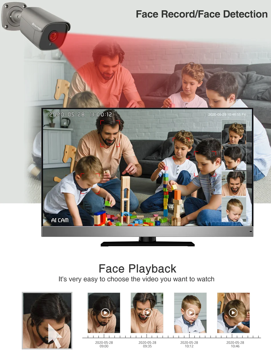 Функция записи распознавания лица: при обнаружении лица NVR сохранит кадры на жестком диске, не пропуская ни одного человека, тем самым улучшая точность оповещения.