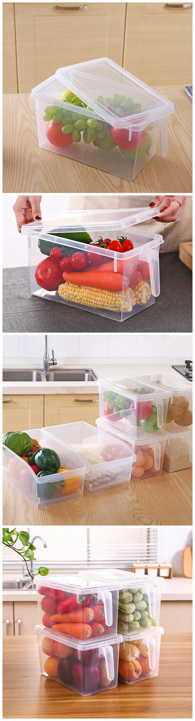 1. Экономит место, прозрачный видимый, свежий. 2. Гладкая и дуговая кромка, не режет руки и овощи. 3. Прозрачный дизайн, хорошо видно овощи. 4. Противоскользящая Нижняя конструкция, место стабильно. Храните овощи в безопасности и свежести. 5. Прочный, противоскользящий, большой емкости, с крышкой, прозрачный. 6. Помогает защитить содержимое от влаги, пыли и других факторов окружающей среды Прочные защелки сохраняют содержимое в безопасности, подходят для любого количества применений. 7. Включает в себя крышку, чтобы сохранить ваши вещи свежими в течение более длительного времени и лучше защитить. 8. Штабелируемый и оснащен встроенной ручкой для удобной переноски. 9. Легко чистить теплой мыльной водой.