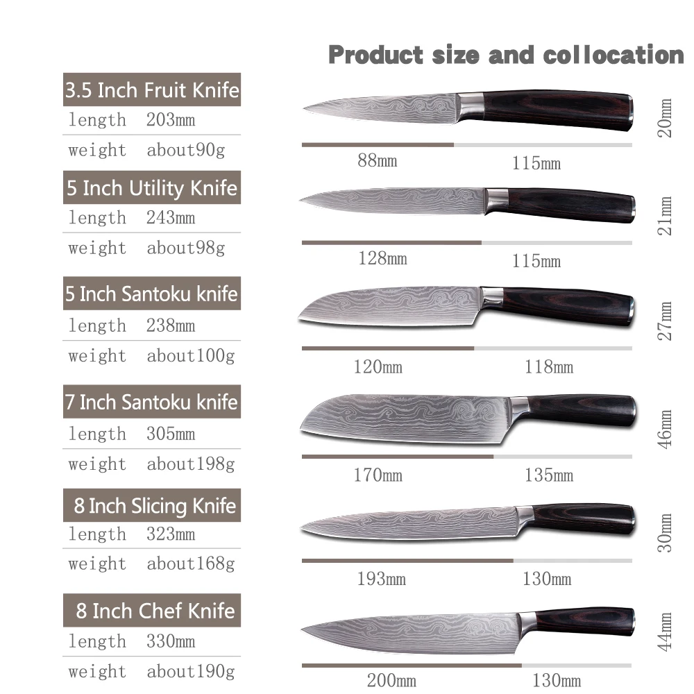 [Наименование]: лазерный дамасский кухонный нож [Лезвие]: 7Cr17 нержавеющая сталь [Ручка]: цветная деревянная ручка стальная головка двойная [Особенности]: острый и прочный; экологичный; легкий