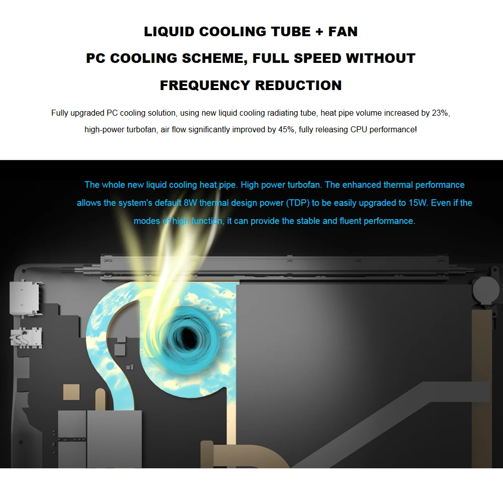 Схема охлаждения ПК, полная скорость без снижения частоты. Полностью Модернизированный охлаждающий раствор для ПК, с использованием новой охлаждающей жидкости излучающей трубки, объем тепловых труб увеличился на 23%, мощный Турбовентилятор, поток воздуха значительно улучшился на 45%, полностью выпуская производительность процессора.