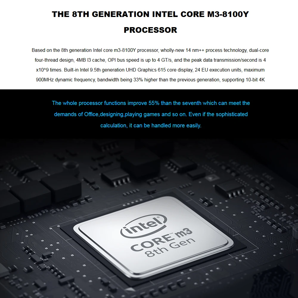 Принимает m3-8100Y процессор, полностью новая технология 14 нм + +, двухъядерный четырехниточный дизайн, кэш 4 Мб l3, скорость шины OPI до 4 GT/s, И пиковая передача данных/секунда 4x10 ~ 9 раз. Встроенный процессор Intel 9.5-го поколения UHD Graphics 615 core display, 24 блока исполнения ЕС, Максимальная динамическая частота 900 МГц, пропускная способность на 33 раза выше, чем предыдущее поколение, поддержка 10-битного декодирования пленки 4K VP9, выход 4K * 2K/60p HD видео через интерфейс HD.