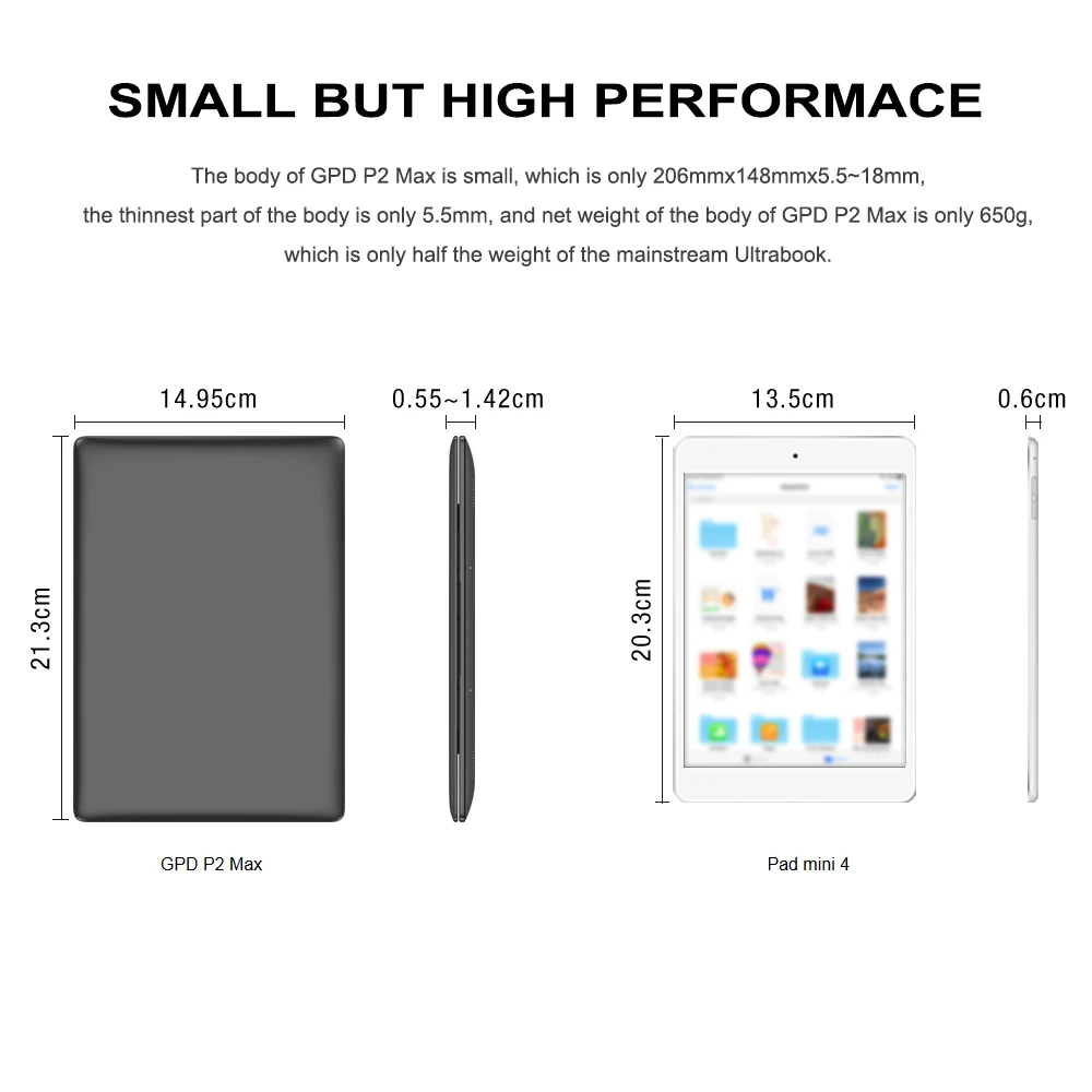 Корпус GPD P2 Max небольшой, это всего лишь 206mmx148mmx5.5 ~ 18 мм, самая тонкая часть корпуса составляет всего 5,5 мм, а вес нетто корпуса GPD P2 Max-650 г, это всего лишь половина веса основного ультрабука.