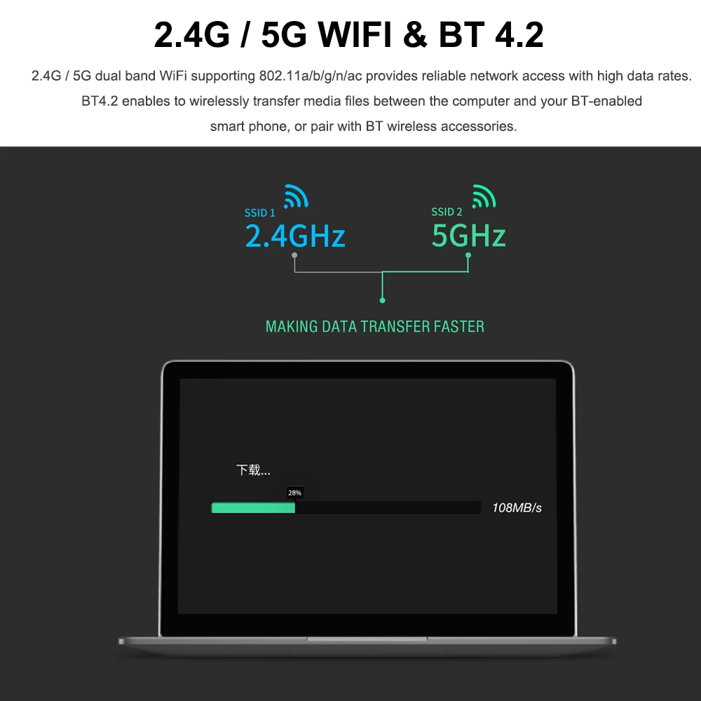 Двухдиапазонный WiFi 2,4G / 5G поддержка 802.11a/b/g/n/ac обеспечивает надежный доступ к сети с высокой скоростью передачи данных. BT4.2 позволяет осуществлять беспроводную передачу мультимедийных файлов между компьютером и смартфоном с поддержкой BT или сопряжение с беспроводными аксессуарами BT.