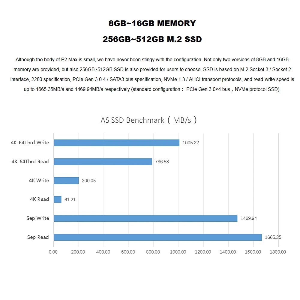 16 Гб памяти и 512 ГБ SSD предоставляются для пользователей на выбор. SSD основан на M.2 Socket 3 / Socket 2 interface, 2280 specification, PCIe Gen 3,0 4 / SATA3 Спецификация шины, NVMe 1,3/AHCI протоколы транспортировки, скорость чтения-записи составляет до 1665,35 МБ/с./с и 1469,94 МБ/с./с соответственно (стандартная конфигурация: PCIe Gen 3,0x4 bus,NVMe протокол SSD).