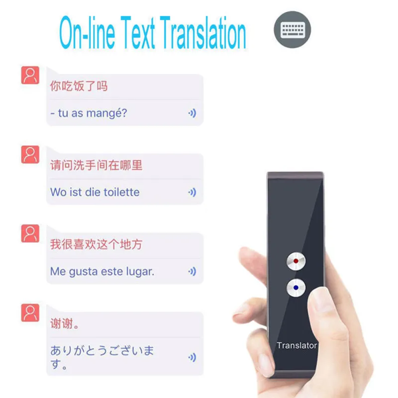 Этот продукт-умный голосовой переводчик, интерактивный переводчик в режиме реального времени, который может переводить 40 языков для обучения, путешествий, бизнеса и встреч, таких как английский, китайский, японский, испанский и многое другое. Используя интеллектуальную технологию распознавания речей, он может переводить запись звука в текст и одновременно передавать в голосовой выход. Четкое качество звука, отсутствие шума и простота переноски, это, безусловно, ваш лучший партнер в области связи.