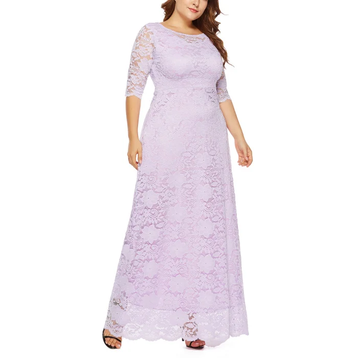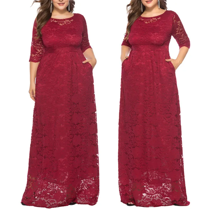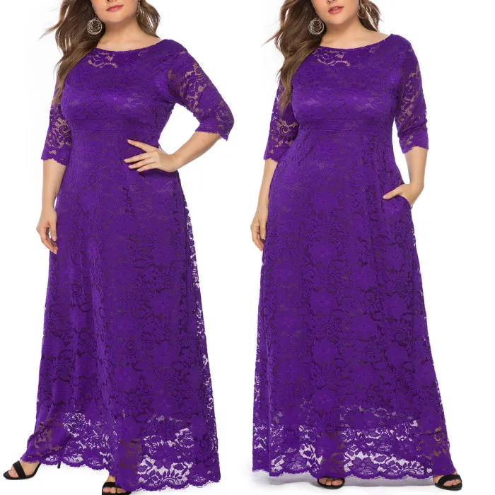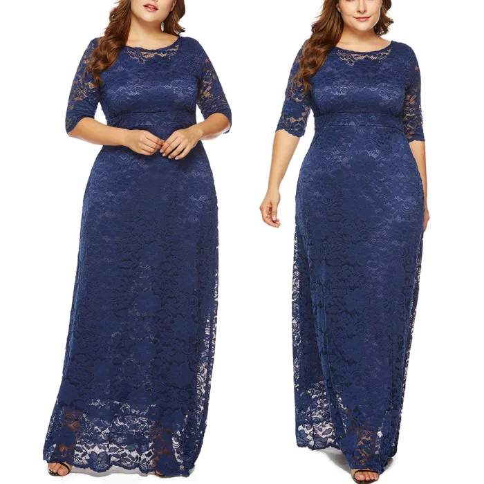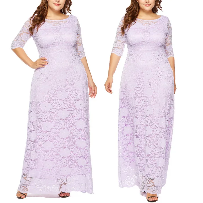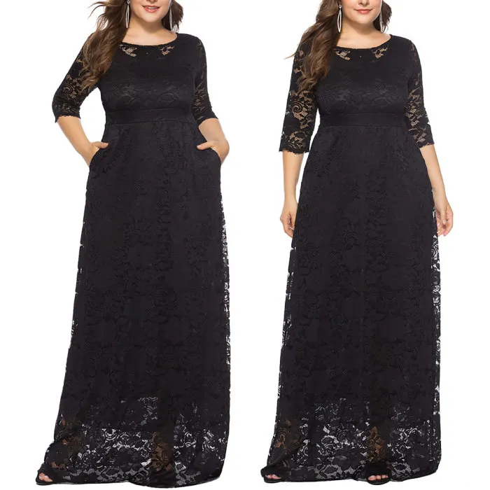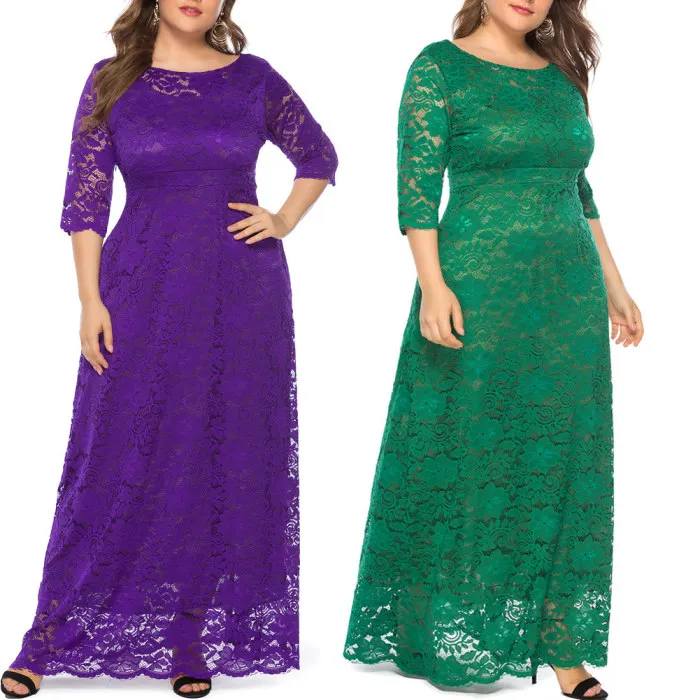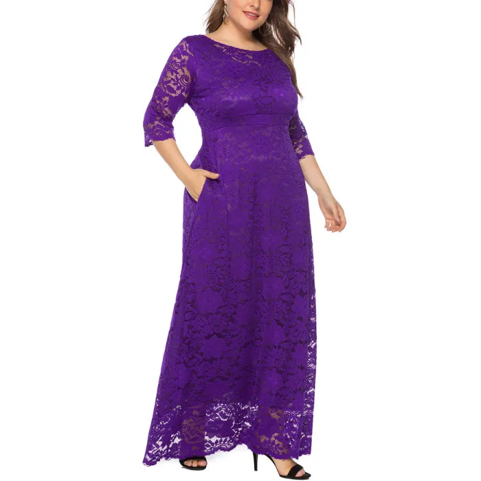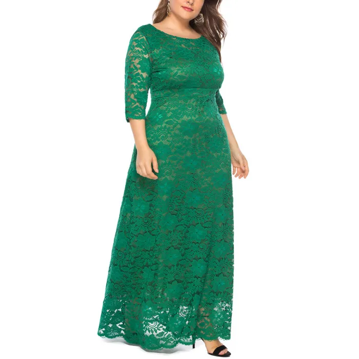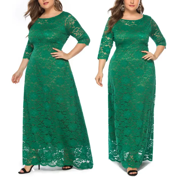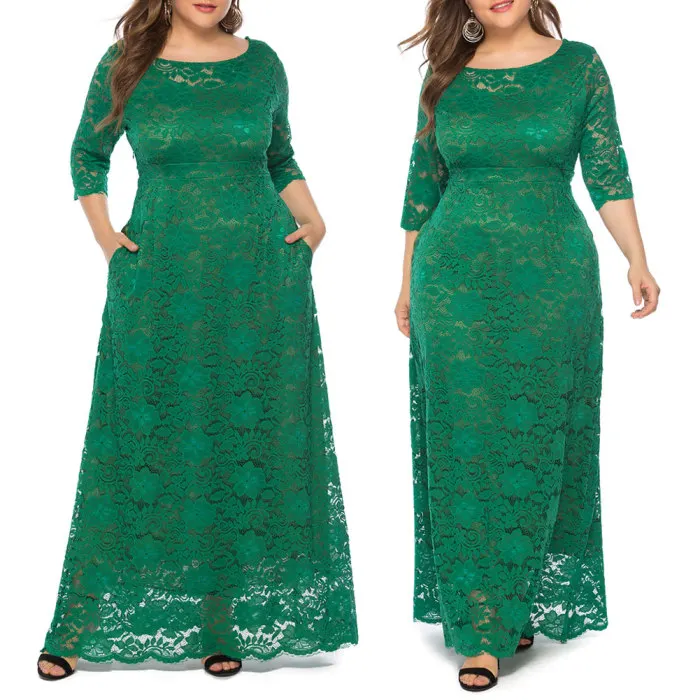 Рукав 3/4, длина в пол, округлый вырез размера плюс Макси платье кружевное длинное платье.