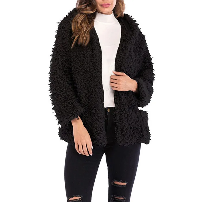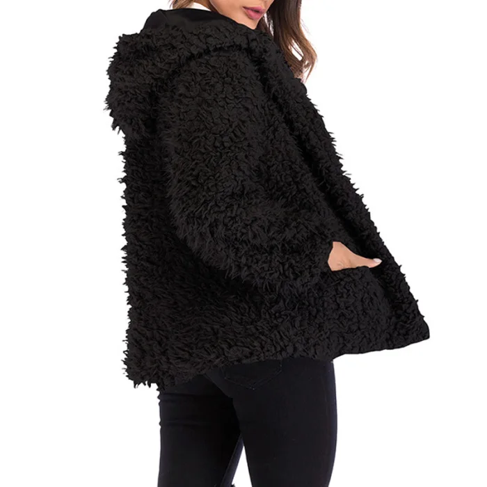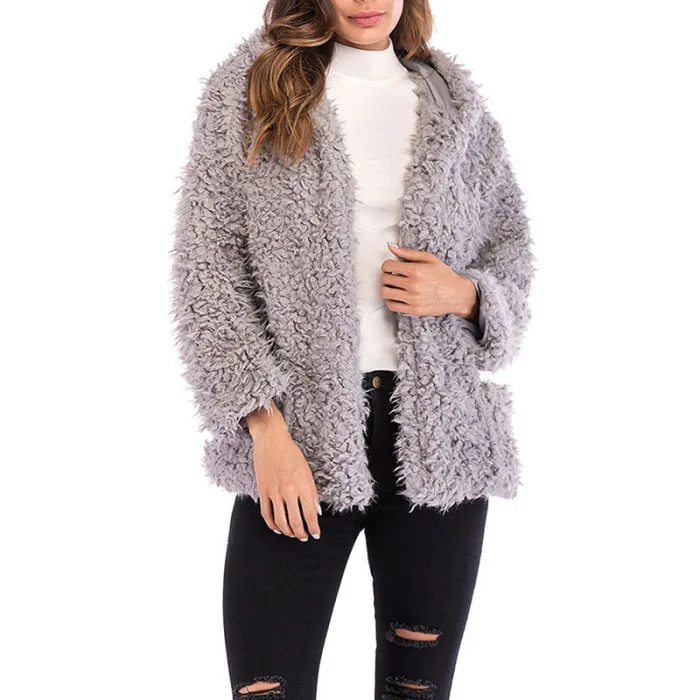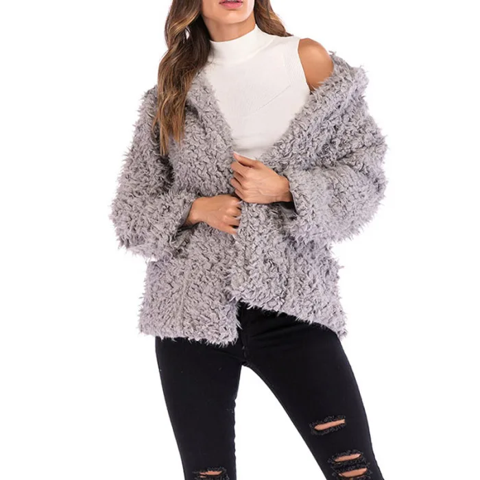 Женское короткое пальто с капюшоном, повседневное Свободное пальто с длинным рукавом из искусственной овчины на молнии, теплый кардиган, куртки JS26