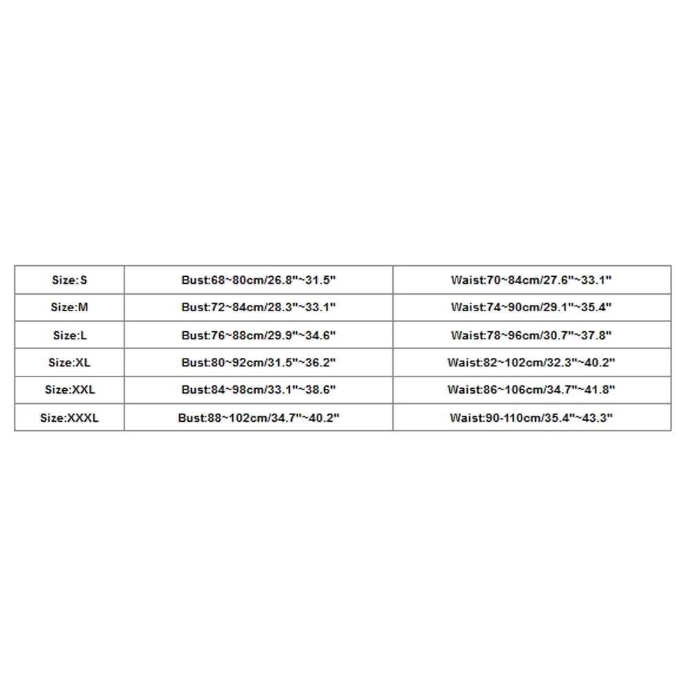 Размер Бюст Талия S 68 ~ 80 см/26,8 "~ 31,5" 70 ~ 84 см/27,6 "~ 33,1" М 72 ~ 84 см/28,3 "~ 33,1" 74 ~ 90 см/29,1 "~ 35,4" L 76 ~ 88 см/29,9 "~ 34,6" 78 ~ 96 см/30,7 "~ 37,8" XL 80 ~ 92 см/31,5 "~ 36,2" 82 ~ 102 см/32,3 "~ 40,2" XXL 84 ~ 98 см/33,1 "~ 38,6" 86 ~ 106 см/34,7 "~ 41,8" XXXL 88 ~ 102 см/34,7 "~ 40,2" 90-110 см/35,4 "~ 43,3"