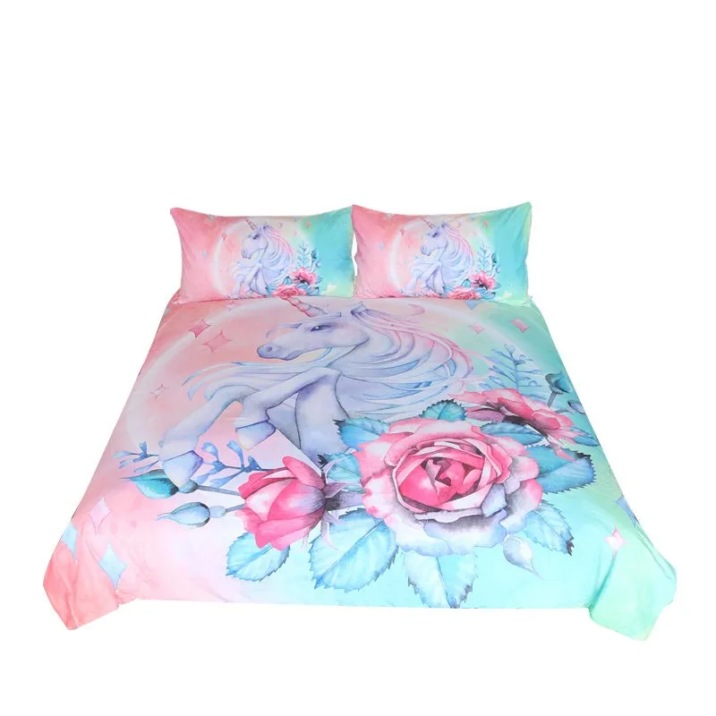 Unicorn Bedding Set Cartoon for Kids Rose Duvet Cover Girly Twin Queen King Bed Set Pink Blue Bed Cover Floral Home Textiles