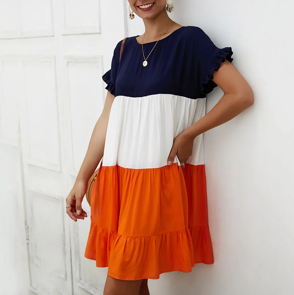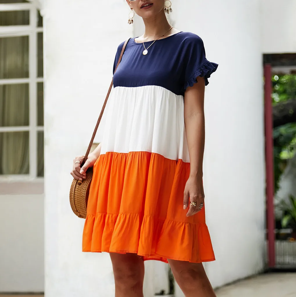 Для женщин Повседневное из Лоскутной Ткани с круглым вырезом короткий рукав многослойное свободное Мини Вечерние платья