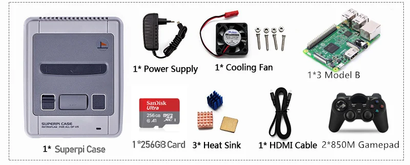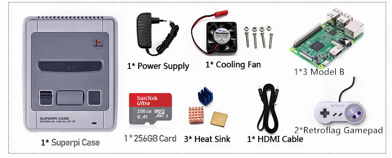 1 x чехол SuperPi-J 3 x радиатор 1 х Вентилятор охлаждения 1 x источник питания EU/UK/US/AU 5V 3A (пожалуйста, оставьте нам сообщение для подходящей вилки.) 1 х 1,5 м Кабель HDMI 1 x TF карта 32 Гб (С системой Recalbox, более 10000 игр) 1 x Raspberry 3 Model B board 2 x USB контроллера(Не контроллер ретрофлага)