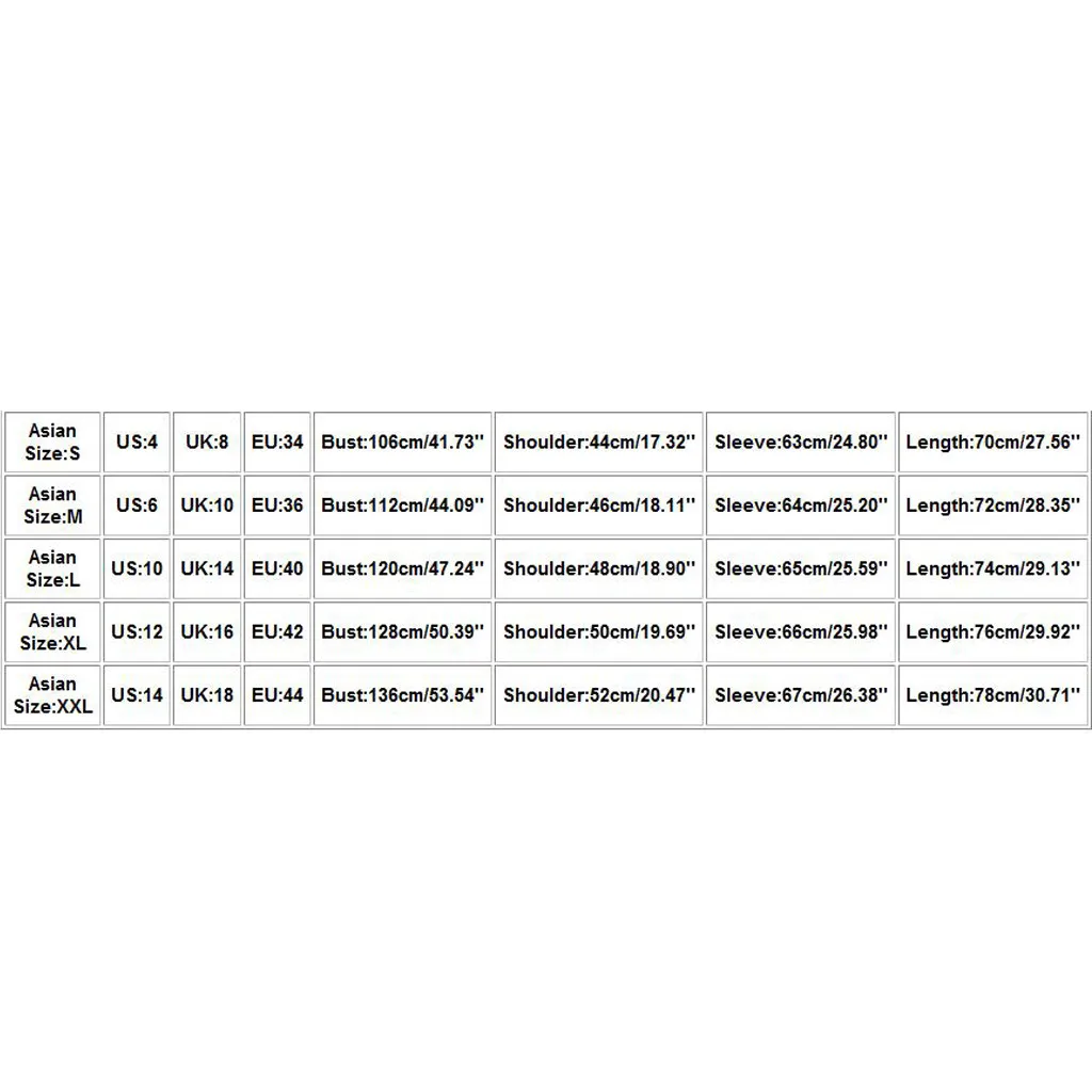 Азиатский размер США Великобритания ЕС Бюст Плечо Рукав Длина S 4. 8 34 106 см/41,73'' 44 см/17,32'' 63 см/24,80'' 70 см/27,56'' М 6 10 36 112 см/44,09'' 46 см/18,11'' 64 см/25,20'' 72 см/28,35'' L 10 14 40 120 см/47,24'' 48 см/18,90'' 65 см/25,59'' 74 см/29,13'' XL 12 16 42 128 см/50,39'' 50 см/19,69'' 66 см/25,98'' 76 см/29,92'' XXL 14 18 44 136 см/53,54'' 52 см/20,47'' 67 см/26,38'' 78 см/30,71''