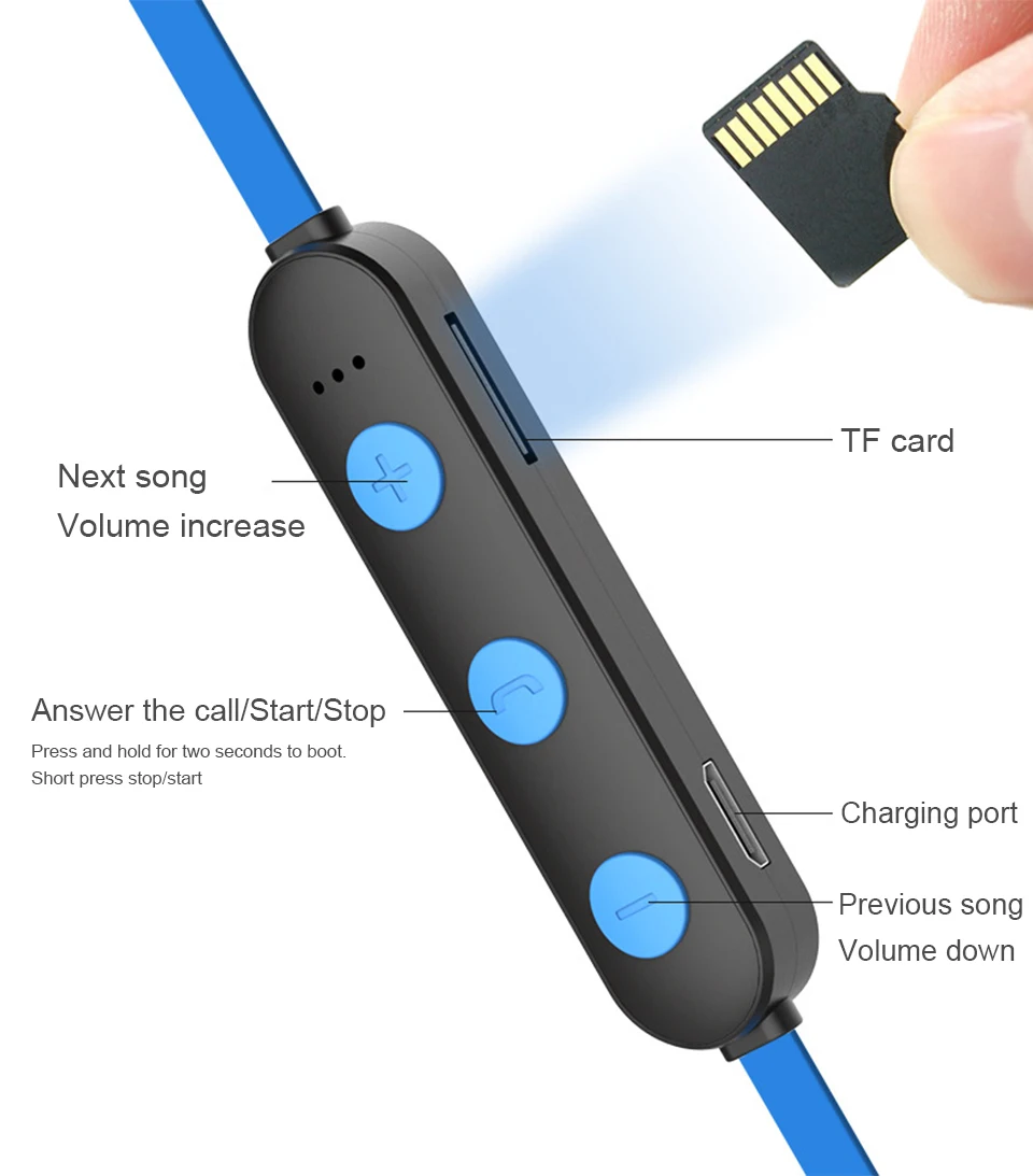 Параметр: Название: спортивные наушники с Bluetooth Цвет: черный/синий/красный Сопротивление динамика: 32 Ом Частота динамика: 20 Гц ~ 20 кГц Номинальная мощность динамика: 3 мВт Чувствительность динамика 1k: 98 дБ Время разговора (средний объем): 3 ч Время воспроизведения музыки (средняя громкость): 3 ч Время работы в режиме ожидания: 160 ч Версия Bluetooth: 5,0 + edr Расстояние передачи (м): 7-10 метров Потребляемая мощность: 18-22 мА · ч Входная мощность: 93 МВт Время зарядки: 0,6 ч Емкость аккумулятора: 75 мАч Канал: стерео Поддержка tf-карты: Поддержка Батарея напряжение: 3,2 V-4,2 V Функция изменена: вставьте tf-карту, tf-карта имеет песни для автоматического чтения песен tf-карты. Изменение режима Bluetooth: Длительное нажатие +-вычитание, чтобы переключиться назад в режим Bluetooth