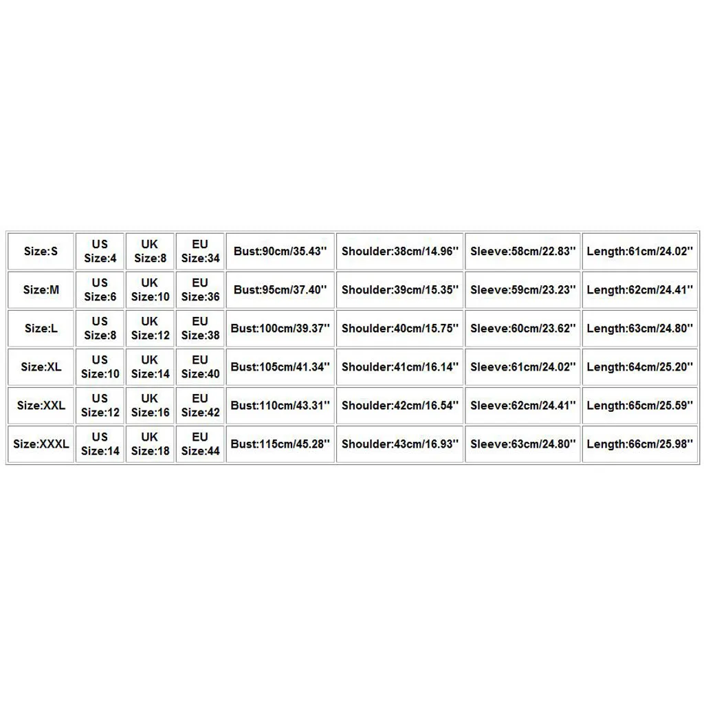 SizeUS SizeUK SizeEU SizeBustShoulderSleeveLengthS483490cm/35.43''38cm/14.96''58cm/22.83''61cm/24.02''M6103695cm/37.40''39cm/15.35''59cm/23.23''62cm/24.41''L81238100cm/39.37''40cm/15.75''60cm/23.62''63cm/24.80''XL101440105cm/41.34''41cm/16.14''61cm/24.02''64cm/25.20''XXL121642110cm/43.31''42cm/16.54''62cm/24.41''65cm/25.59''XXXL141844115cm/45.28''43cm/16.93''63cm/24.80''66cm/25.98''Size:SUS Size:4UK Size:8EU Size:34Bust:90cm/35.43''Shoulder:38cm/14.96''Sleeve:58cm/22.83''Length:61cm/24.02''Size:MUS Size:6UK Size:10EU Size:36Bust:95cm/37.40''Shoulder:39cm/15.35''Sleeve:59cm/23.23''Length:62cm/24.41''Size:LUS Size:8UK Size:12EU Size:38Bust:100cm/39.37''Shoulder:40cm/15.75''Sleeve:60cm/23.62''Length:63cm/24.80''Size:XLUS Size:10UK Size:14EU Size:40Bust:105cm/41.34''Shoulder:41cm/16.14''Sleeve:61cm/24.02''Length:64cm/25.20''Size:XXLUS Size:12UK Size:16EU Size:42Bust:110cm/43.31''Shoulder:42cm/16.54''Sleeve:62cm/24.41''Length:65cm/25.59''Size:XXXLUS Size:14UK Size:18EU Size:44Bust:115cm/45.28''Shoulder:43cm/16.93''Sleeve:63cm/24.80''Length:66cm/25.98''