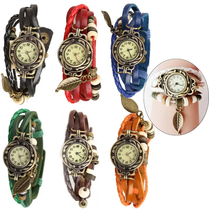 Новый винтажный браслет кварцевые наручные часы с переплетением Обертывания Кожаный ремешок лист бусины для женщин MV66