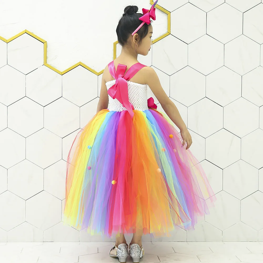 Милое Радужное платье-пачка ярких цветов для девочек; Разноцветное платье до щиколотки с помпонами; Карнавальный костюм леденца; Детская одежда на день рождения
