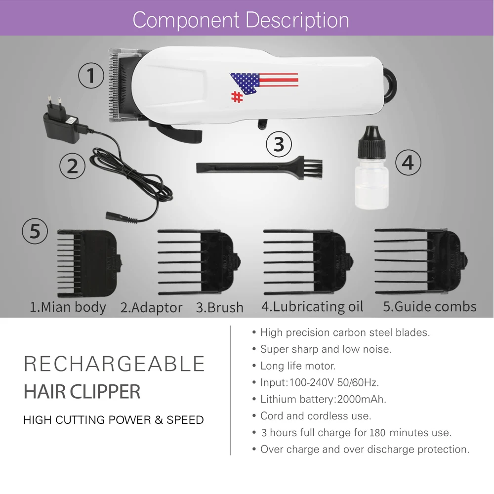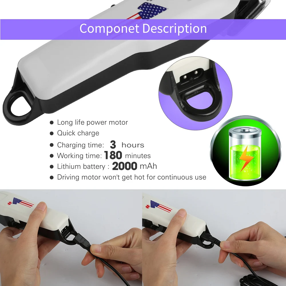Примечание: 1. Это штепсельная вилка европейского стандарта. Мы предоставим вам бесплатный адаптер преобразования в соответствии с страной или районом, если вам нужен адаптер США. Особенности: 1. Сильная мощность: Принятие специального двигателя, 8200 оборотов в минуту. 2. Острый наконечник керамического инструмента: Керамический нож отличается острой стойкостью к истиранию, фиксированный титановый нож не вызывает аллергии на кожу. 3. Пять скорости тонкой настройки + четыре предельных гребня: В зависимости от длины волос, обрезки режущей головки или установки ограниченной гребень. Длину ограниченной гребни можно изменить. 4. Ультра-низкий бесшумный дизайн: Шумоподавление, называемое Q-SUS, делает шум менее 60 дБ, Гораздо ниже, чем стандарты ЕС, который составляет 70 дБ. Спецификация: Цвет: белый Размер корпуса: около 17,3x4,6x4,5 см Материал резца: титановая керамика Рабочее напряжение двигателя: 3 в Входное напряжение: 100V-240V 50/60Hz Выход: AC 3V 1000mA Время зарядки: 4-6 часов Время работы: 60-90 минут Стандарт адаптера: штепсельная вилка европейского стандарта Подходит для: всех домашних животных Размер упаковки: 27x20x6 см Посылка включает в себя: 1x машинка для стрижки 4x лимит расчески (3-6-9-12mm) 1x щеточка для чистки 1x руководство по эксплуатации на английском языке 1x адаптер (это штепсельная вилка европейского стандарта. Мы предоставим вам бесплатный адаптер преобразования в соответствии с страной или районом, если вам нужен адаптер США.)