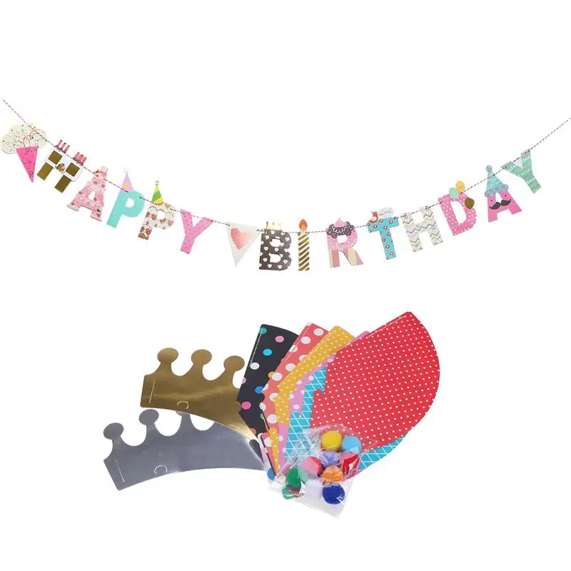 Это набор баннеров с днем рождения бумаги вечерние шляпы и короны для празднования дня рождения, которые сделают уникальные вечерние дополнение и создадут прекрасные воспоминания для вас и ваших детей. Просто Повесьте этот баннер в детскую комнату или гостиную для дополнительного удовольствия и нового образа, чтобы создать праздничную и счастливую атмосферу.