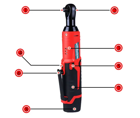 Трещоточный ключ поставляется с набором из 2 долговечных и перезаряжаемых литий-ионных батарей 12 В.