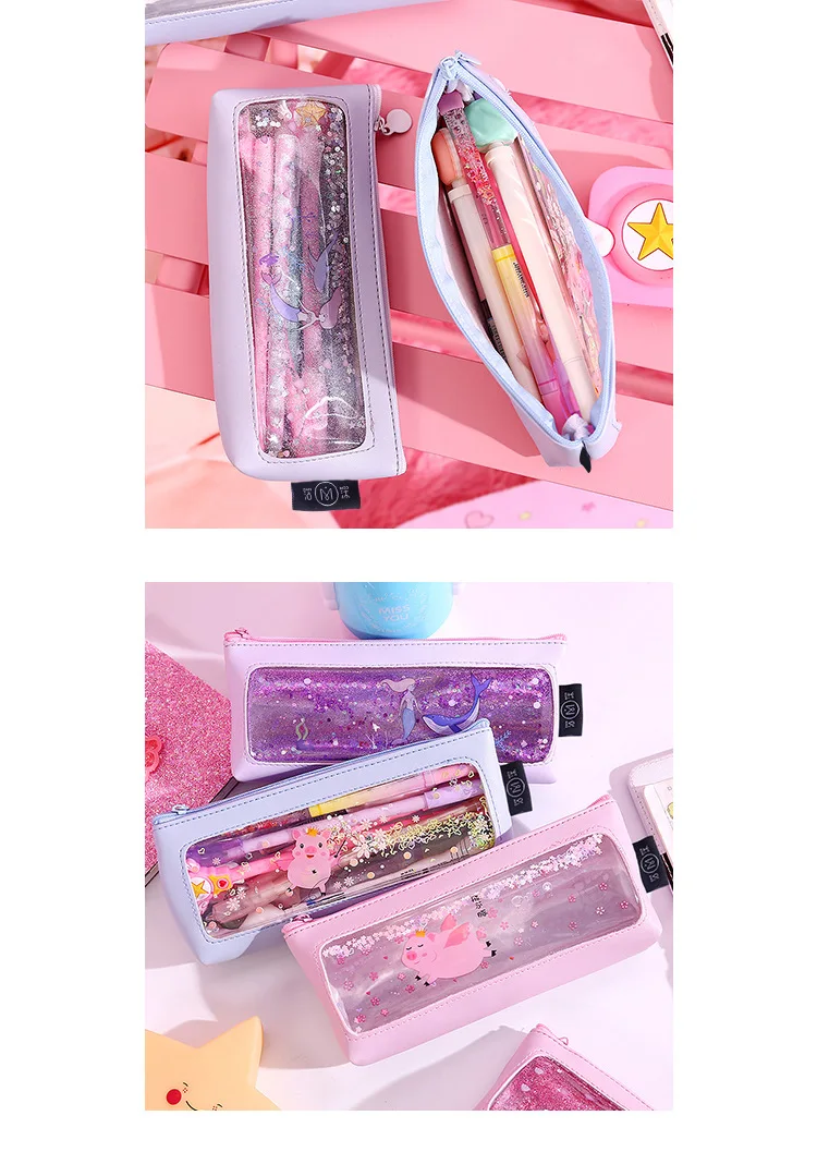 Кавайный чехол-карандаш с зыбучим песком и русалочкой из искусственной кожи с большой емкостью, милый розовый чехол-карандаш с изображением поросенка для ручка для девочек, школьные принадлежности