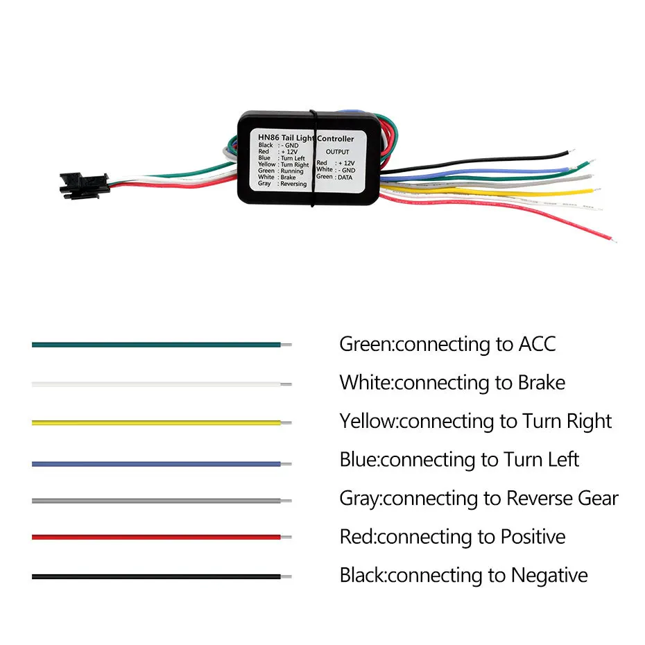 Есть шесть входных проводов между продуктом и внешней частью, использование следующим образом: 1. Красный провод: подключение к аноду ACC 2. Черный провод: Подключите катод или провод заземления 3. Зеленый провод: подсоединить АКК анод задний светильник будет светильник голубого цвета 4,4. Белый провод: Подключите АКК анод тормозной светильник, в то время как тормоз будет светильник красного цвета 5. Желтый провод (слева): Подключайтесь к ACC анод движение задним ходом, левый поворот светильник, светильник становится красным справа налево 6. Желтая проволока (справа): Подключите анод ACC, правый поворотный светильник, красный светильник слева направо 7. Двойной светильник: Красный светильник будет проходить от середины к обеим сторонам