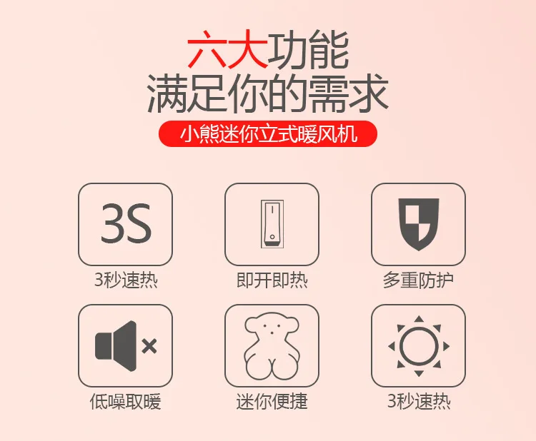 Когда нагревательный элемент PTC работает, воздух нагревается и горячий воздух выдувается вентилятором, чтобы генерировать тепло. С эффективным конвекционным режимом воздухозаборника, вы можете быстро генерировать много тепла в течение 3 секунд. Этот мини-обогреватель сопровождает вас в холодную зиму.