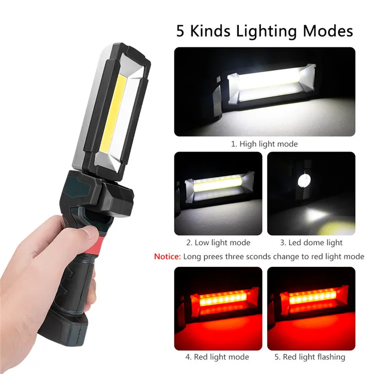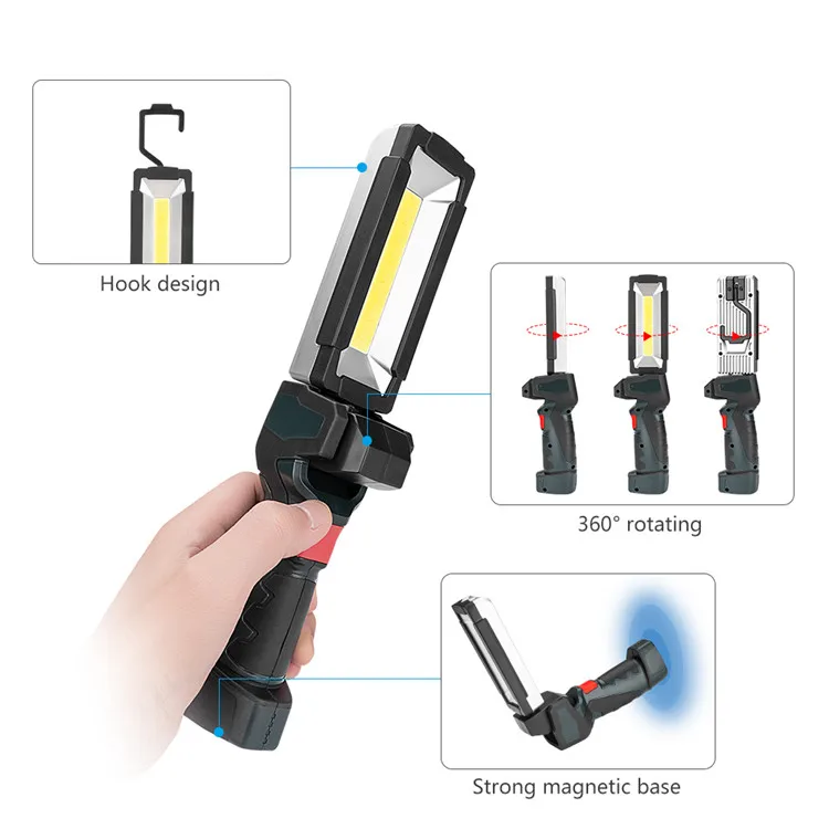COB светодиодный, яркий и энергосберегающий. С мощным магнитом на нижней стороне, вы можете прикрепить его к автомобилю или другой металлической поверхности, чтобы использовать как рабочий светильник, лампа для кемпинга. Поставляется с поворотным крюком на 360 градусов, что делает его отличным дополнением к любой мастерской или гаражу. Гибкий, головка 180 градусов регулирует угол луча в соответствии с вашими потребностями. Двойной интерфейс USB, интерфейс micro USB для зарядки рабочего света и другой выходной интерфейс для зарядки электрического устройства, например телефона. Помогите себе в поломке или экстренном использовании-черные выходы, аварийные ситуации на дорогах, штормы, общежития колледжа, светильник для ремонта автомобилей, подвесной светильник для палатки, SOS для выживания на открытом воздухе.