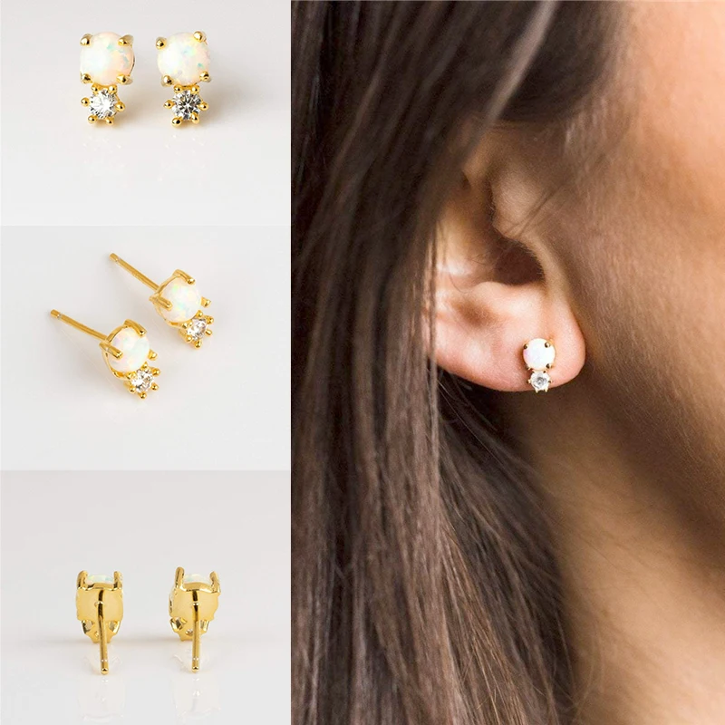 ROXI Мода Smalll милые серьги-гвоздики круглые белые огненные опаловые серьги для женщин маленький фианит камень рождения Двойные серьги ювелирные изделия