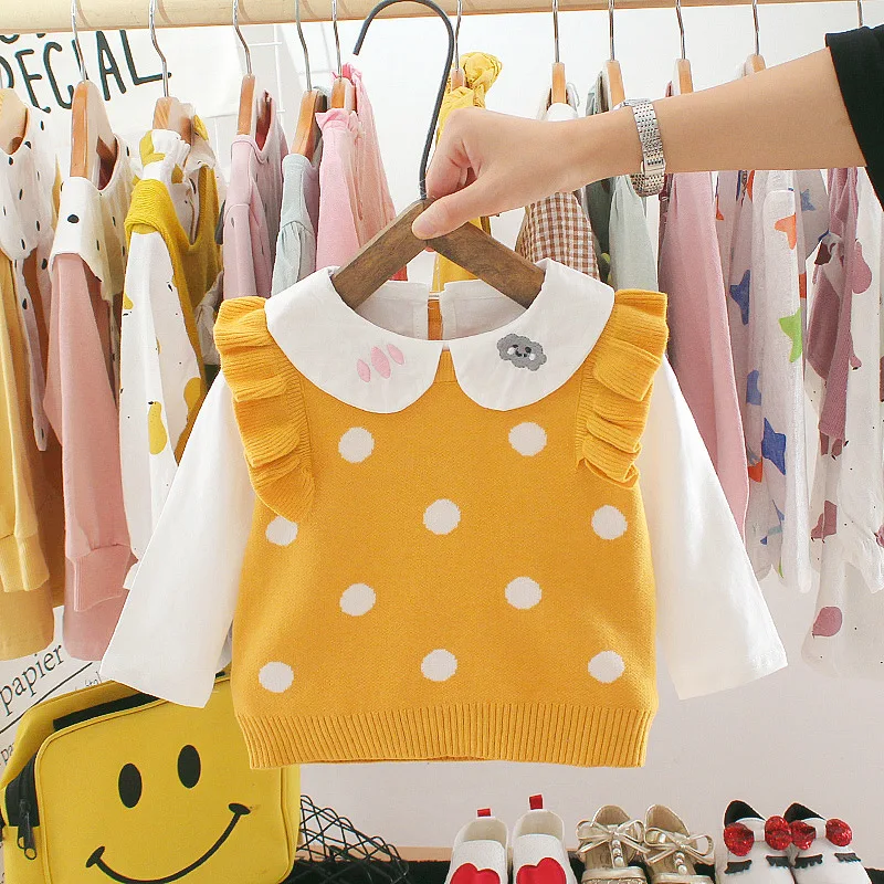 Хлопковая футболка с длинными рукавами для маленьких девочек; Свитер с воротником для девочек; Рубашка для малышей; Сезон весна-осень; Повседневные топы; Комплект с жилетом